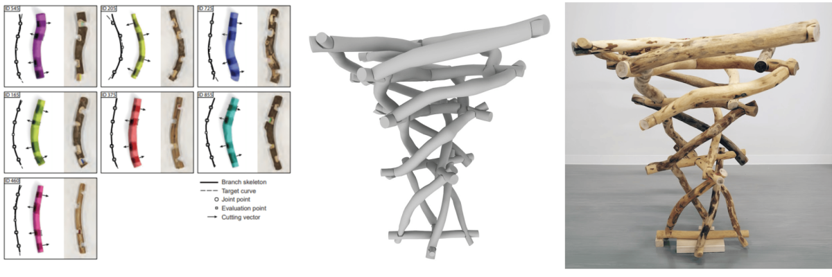 木の枝ぶりを整えて手入れをしたり、まっすぐな太い幹に成長させるよう枝を剪定しますが、切った枝は利用価値が低く、一部を除いて燃やすなどで処分されていました。そこで作ったのが「Branch」です。これは1本ずつ形の異なる枝をスキャンしてコンピューターに取り込み、データを組み合わせていろいろなデザインができるソフトです。元々捨てられていた枝をそのままの形で別の用途に変えることで、高い価値を持たせた再利用ができることが特徴です。
