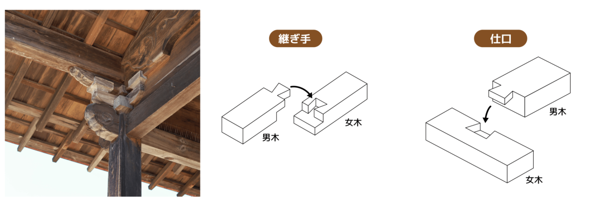 釘や接着剤を使用せず立体パズルのように、木材同士を組み上げる技術が木組みです。木材を組む方向で呼び方が違います。(写真:厳島神社能舞台の木組み)