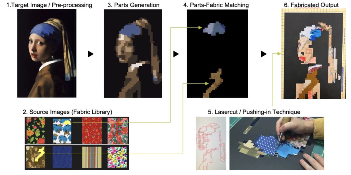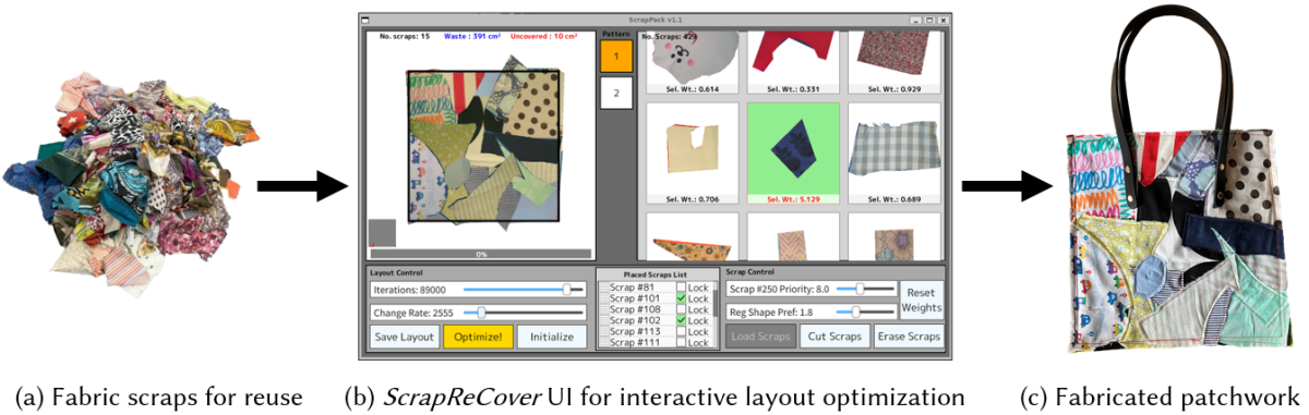 また、布の端切れからパッチワークをデザインするためのインターフェースも作成しました。これは、形が不揃いな布の端切れを指定したエリア内にきっちりと収まるようにレイアウトをしてくれるソフトウェアです。、ソフトウェアがユーザーを支援してデザインできるようにするものです。