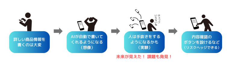 実験して観察をした結果、人はAIを頼りきり、説明文の正誤を確認しなくなり、正しくない出品情報が流れるリスクが見えてきました。これはユーザーにとってもメルカリにとっても良くない未来です。そしてリスクが分かれば、出品情報を確認したことを示すボタンを設けるなど、対応策を考えることが出来るようになります。このような流れで進めています。