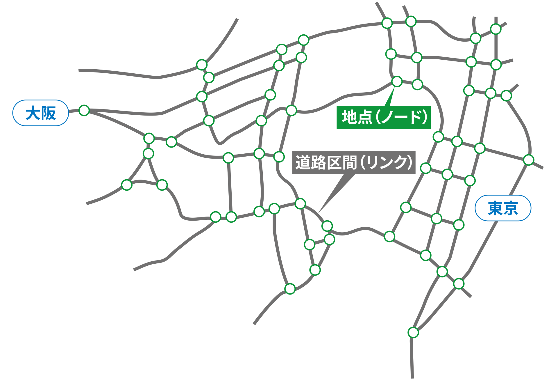 例えば、東京 – 大阪間に存在する交差点や分岐点などの「地点(ノード)」と、それらのどことどこを結ぶ「道路区間(リンク)」があるか、さらに各道路区間の距離情報を抽出します。次に、この情報を使って、東京駅のノードから通天閣のノードまでに至る経路を探索します。このとき、経路の長さは、経由するすべての区間(リンク)の距離を合計した値とします。