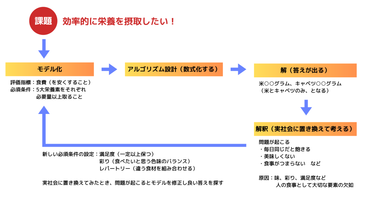 最初に、お金をかけずに栄養条件を満たせるような食品は何か?と問われたら、単純に栄養効率がいいもの、が思い浮かぶと思います。そこでまずモデル化のひとつとして解いてみる、と言うことが大事なんです。そうしないと何が大事なものなのか、逆に省けるものは何か、が分かりません。だから、最初に本質だけで解を求めそこから改善していく、というプロセスになるんです。