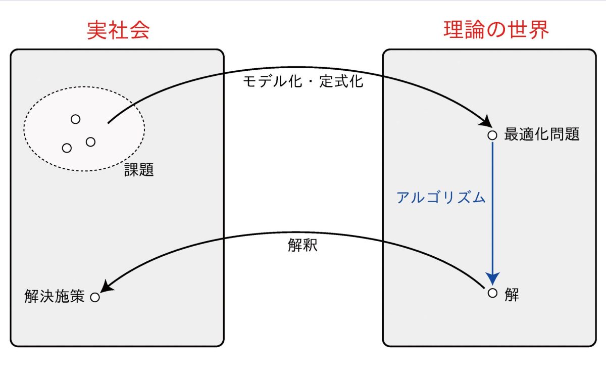 例えば、東京駅前から大阪の通天閣まで車で行くという課題があるとします。最初に課題に対する評価指標は何かを設定します。早く行く、安く行く、最短で行くなどいろいろな考えがある中で、ここでは「移動距離の短さ」を評価指標に決めます。決まったら次にモデル化を行います。モデル化とは現実の世界から本質を取り出し、理論の世界で表現し直すことです。