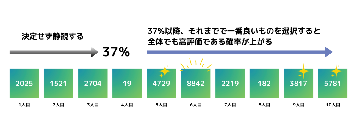 その確率を上げることを数学で考えることができます。実は秘書問題では、最初の37%までは意思決定を見送り、それ以降で決断すると最良の選択ができる確率が高いという「37%ルール」があります。これは実際に意思決定時の考え方として参考にされています。